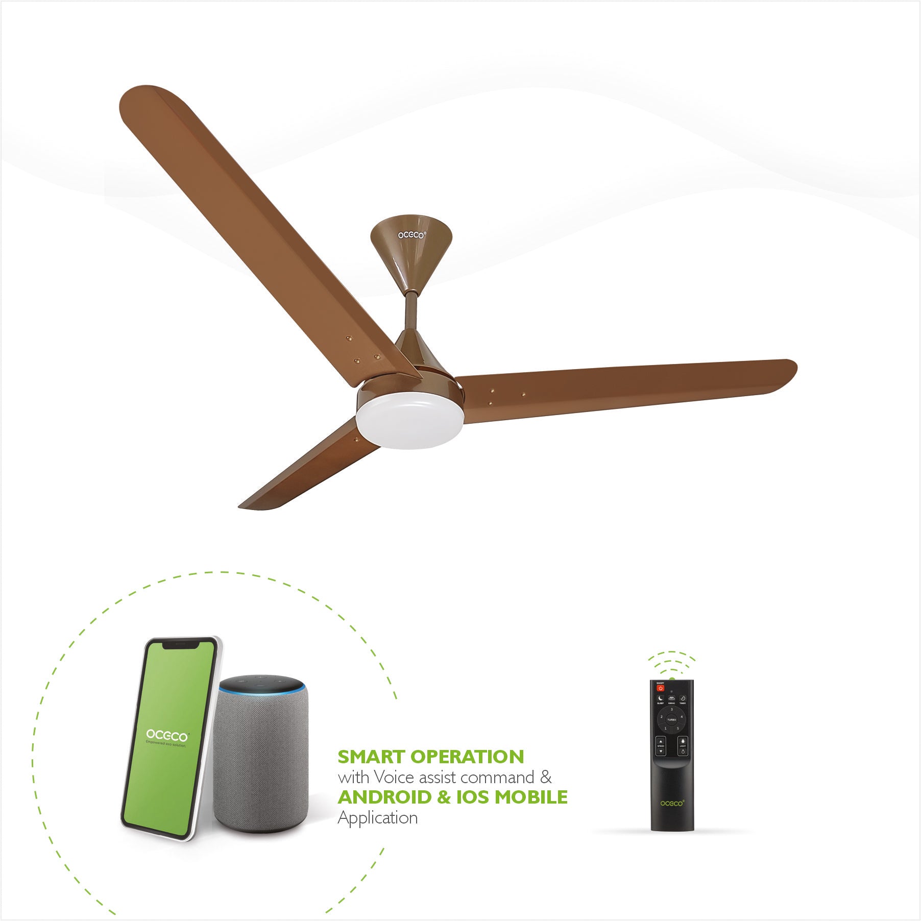 • Product Details: OCECO Fansio Smart Ceiling Fan | Motor: 1200mm BLDC | Features: Smart Remote, Alexa & Mobile Application | Blade: 3 Blade Fan | Warranty: 3 Years | Design: Ceiling Fan | Power Voltage: 230 V | Material: Aluminum | Power Source: Corded Electric.